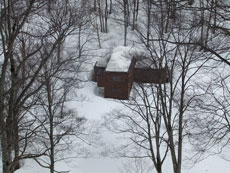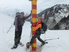 | a.m.9:59 文登研前進基地が見える。 | a.m.10:01 一旦降りて・・・ (スノーシューを外す。) |
