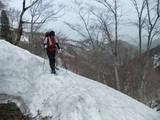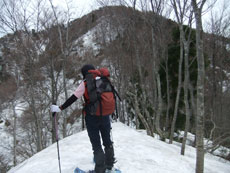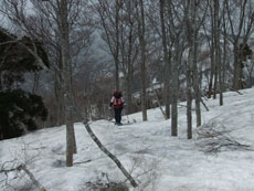 雪の急斜面の突端はヤブだったが、再び 林道に出て、5~10分程七姫山側に歩き、 940m付近で、右側の尾根に取り付く。 |