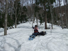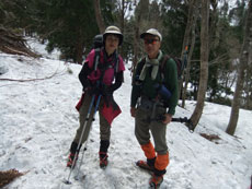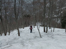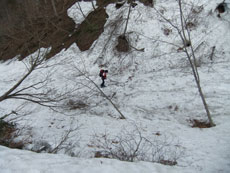 雪に隠れているがぐるっと回っている林道 をショートカットするために、急斜面を一気 に登る。金光夫妻が見守ってくれていた。 |
