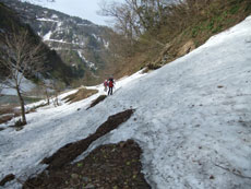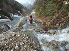 | クムジュン横の人津谷ゲート | しばらく歩くと、流石に雪が出て来た。 | 雪解けが進み、川のようになっていた所も・ |