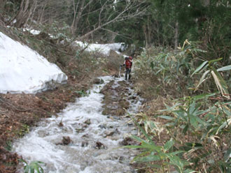 | ショートカットして、林道に出ようと急斜面を降りたのだが・・・ | 高温で雪解けが進み、水量が増えていた。 |