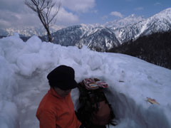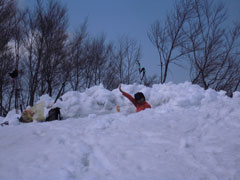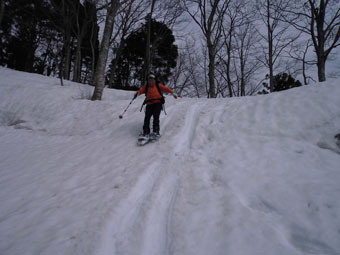| スノーシュー滑りの練習だが・・・ | あえなく転倒! |