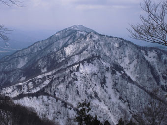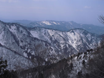 | 七姫山から大辻山(最奥)へ続く稜線。 | 手前尾根が肉蔵山。その奥が高峰山。 うっすら、左最奥が塔倉山。 |