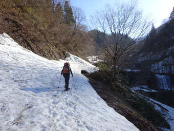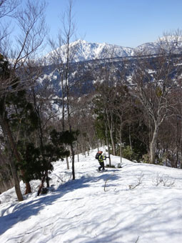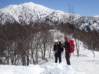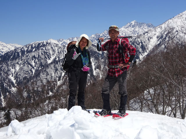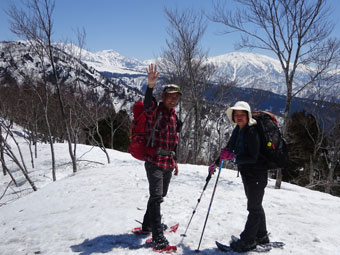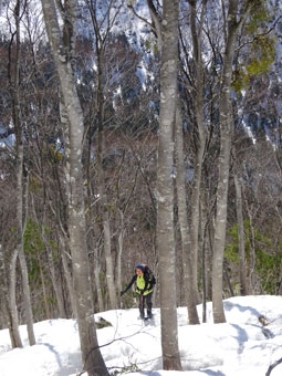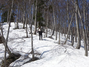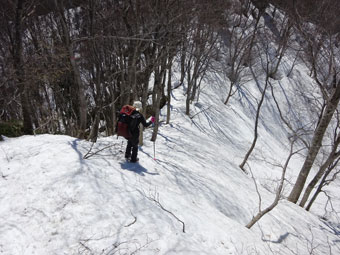 朝方は凍っていた雪面も、午後になれば緩んでくる。しかし、急斜面でのスノーシューは、それなりに大変である。「山ノ神」には、アイゼンを着けてもらった。それでもおっかなびっくりであった。