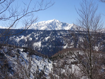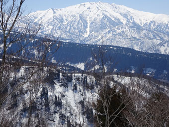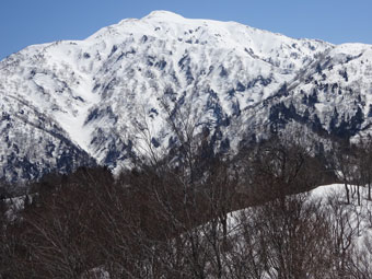 ブナ越しに剱岳が顔を出します。 |