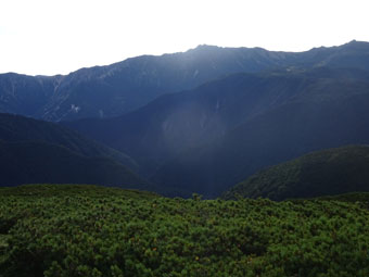 | 朝日を浴びながら、北ノ俣岳へ・・・ |