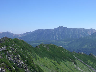 | きれいな山容の薬師岳 | a.m.7:45 まだ中俣乗越を越えなければならない。 |