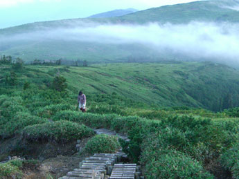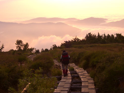 | a.m5:25 長い木道の階段を行く。 | 太郞平小屋が良い雰囲気の中にあるのが見える。 |