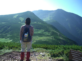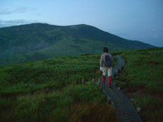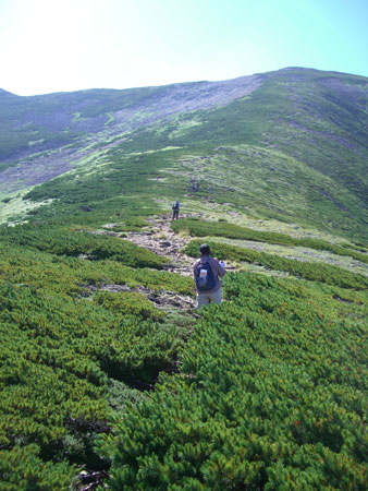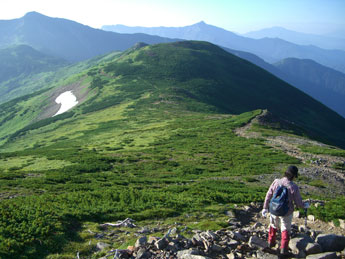 | a.m.6:30 北ノ俣岳山頂で・・ | a.m.6:45 なだらかな稜線を赤木岳に向かって・・ |