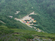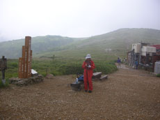 | p.m.2:00頃から雨に見舞われる。 | p.m.2:55 ようやく太郞平に到着! | p.m.3:05 キャンプサイトが見えて来る。 |