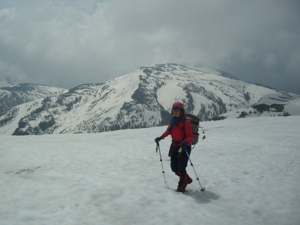 太郎平から薬師峠までは、ちょっぴり木道の上を歩くが大方雪上である。しかし、峠へ降る所は、日当たりの関係なのか夏道が出ている。雪の状態は、気温の上昇からして、緩み加減であったが、アイゼンを装着する。