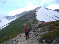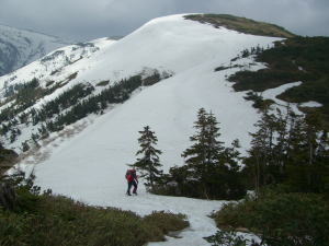 夏道の沢筋を通らず、やや北側を直登する。そして、薬師平に迂回せず、やや北寄りに進路を取り、途中から夏道に合流するようにハイマツの中を横断する。雪斜面に出た頃から雷鳴が轟きイヤな感じになる。東側に雷雲があり、西側には少しであるが、時々青空が覗く。しかし、真っ黒い雲の流れが速い。とにかく薬師岳山荘まで行く事にする。ピカッとなる度に、山の神が怯むが、ハッパをかけるしかない。