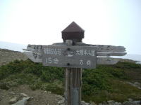 山頂まであと15分の標識のある所でアイゼンを脱ぎ、そのままで先を急いだ。薬師岳山荘手前で、避難小屋から薬師岳山頂付近の上部には青空が見える。と思ったらまたガスに隠れてしまう。その内、アラレが降って来る。とっさに、ヤバイと思った。30年程前、雹が降ったと思ったら、ピカドンと落雷となった事を目の当たりにしているだけにイヤな感じであった。