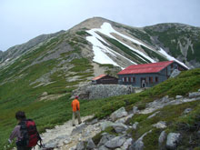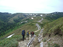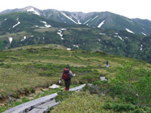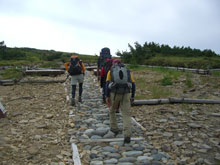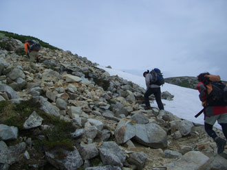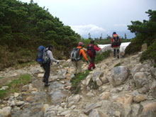 しっかり雨具を纏って、太郎平小屋から15分程、高度で100m位降りたところであったろうか、不覚にも木枠に足を乗せた途端、スリップし大きな事故を起こしてしまった。転倒した瞬間は痛くも何となかった。しかし、軍手をしていた左手の形が可笑しかった。薬指が波打って反り返っていた。恐ろしくて軍手を外せなかった。ようやく軍手を外したら、関節の内側が切れていた。指の中身が見えるようなおかしな色をしていると思ったら、血がポタリポタリと落ちてくるではないか・・・