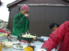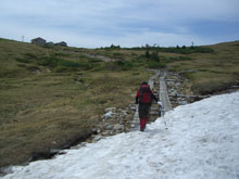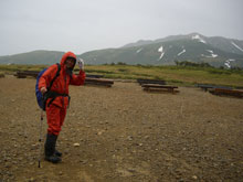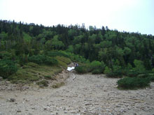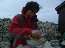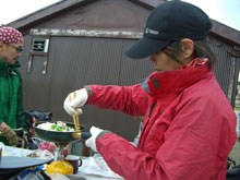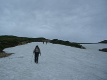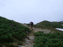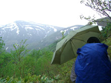 6/29 薬師岳の上部は風が強かった。体感温度だけでなく、実際気温も低かった。薬師岳山荘前に戻ってから、食事になったが、時折、コンロの火が消えたり、料理自体が吹き飛ばされたりした。それでも、薬師峠キャンプ場手前まで雨はもった。その内、良かった視界も次第に雨の中に霞んでいった。