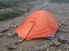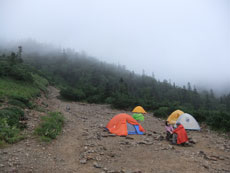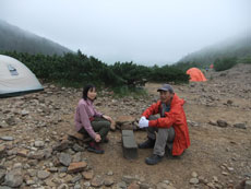 | 薬師峠のテン場。 | 簡単なテーブルを造って、 ささやかな食事となる。 |