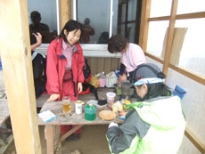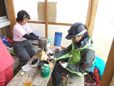 | 「ねぎちゃん」が、やって来てくれて、 太郞平小屋の軒先で食事となる。 |