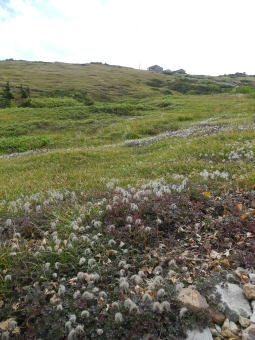 | バックは薬師平 | 山頂に向かう途中、薬師岳山荘を振り返る。 |