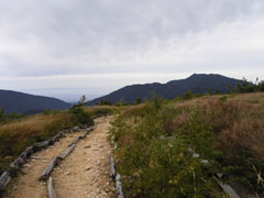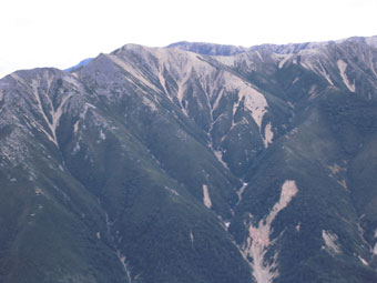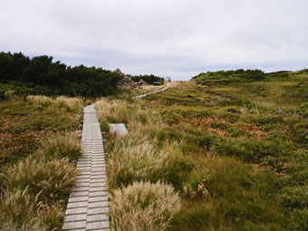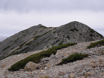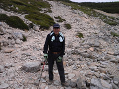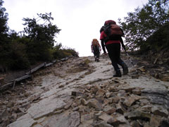 | 一見滑りそうだが・・・ | 整備されても、また崩れる登山道を行く。 | 三角点で見えなかった剱岳が・・・ |