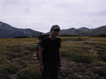 | 槍ヶ岳をバックに (薬師平で・・) | チングルマをバックに (薬師平にて・・) |