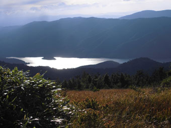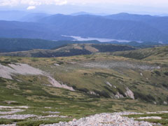 | 有峰湖を見下ろす。 | 振り返れば、鍬崎山が望めます。 | これから登る薬師岳の稜線を望む。 |
