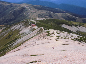 | 山頂から、ちっちゃな避難小屋? | 水晶岳を眺めながら・・・ |