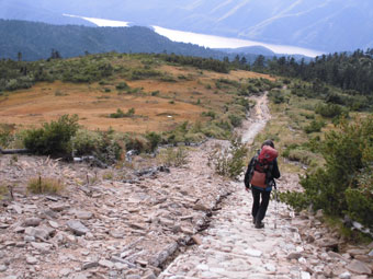 | ようやく薬師岳山荘が見えてきた。 | 勇壮な鍬崎山。 | 有峰湖を見下ろす。 |