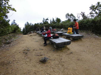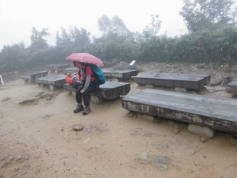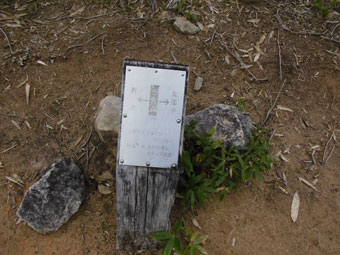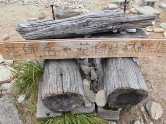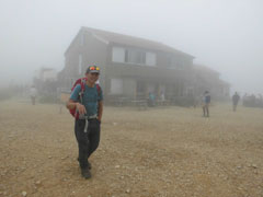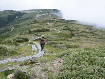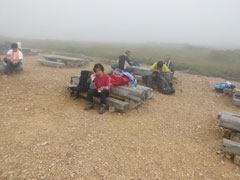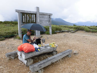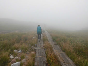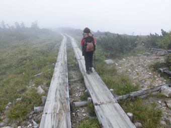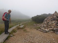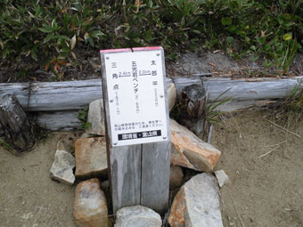 | ガスに覆われた木道を行く。 | 三角点到着。折立まで、あと1時間である。 |