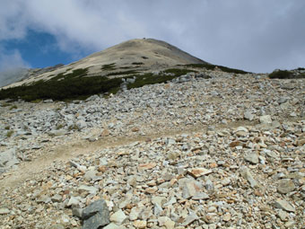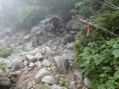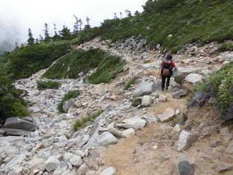 | 予定通り薬師平に着き歩き始める。 | 歩き難いガラ場を行く。 |