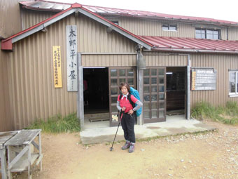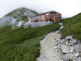 | 薬師平から、一気に稜線を目指す。 | 堀井氏が経営する薬師岳山荘。 |