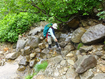 | 薬師峠キャンプ場通過。(10時40分) | 登山道は沢沿いにある。 |