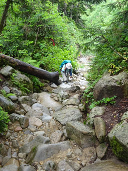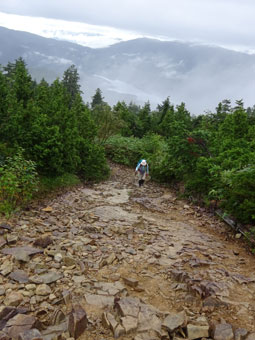 | 石がゴロゴロしていて歩きにくい。 | 太郎平を振り返る。 |