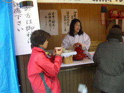 No.201 (H.21.01.01) 御神酒 初登山の尖山で、ラッキーにも、わたすげ夫妻と遭遇した。 わたすげ夫氏の 「山ノ神に、一度お目に掛かりたかった。」 の言葉に、山ノ神が顔を赤くし、「もっと、化粧(厚化粧)をしてく れば良かった。」 と分からぬように呟いていた。 下山時に、わたすげ女史の 「今日も、帰りの車の中で・・・」 には、些か言葉に詰まっていたようである。 そんな山ノ神と尖山の帰路、芦峅の雄山神社に詣った。 初めてであったが、どことなく立山信仰の雰囲気を漂わせていた。 厳かな雰囲気であったが、如何せん、縁起物売り場の中に、 御神酒・無料の文字があり、それが山ノ神の目に入ってしまった。 当然の事のように山ノ神は頂いた。 (ビールでなくても、何でも良いようである。) でも、何だか物足りないようである。 「おいおい、これは、形ばかりの御神酒で、 利き酒会ではないのだよ。」と言ってしまった。