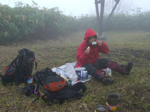 11/2 寒波襲来間近の大滝山頂。何としても山頂で飲みたい山ノ神。 何だかゴロゴロ音がし出し、 雨に、ミゾレが混じり始めた頃。 「やばいぜ!」 と促したら、 ようやく腰を上げた山ノ神。 「もうちょっと、ゆっくりした かった。」のであろうが、お天気が崩れては 致し方ない。 その御神酒の力を借りられたから、再びヤブに突入出来たのかもしれ ないが、「ちょと、甘すぎた。」 が山ノ神の弁。←登山路の事? お酒の事? 何でも、「今日は寒そうだから・・」 と思い「ハイチュー」 いや、 「チューハイ」 にしたのだそうだが、「日本酒にすれば良かった!」 とは、何たる事! 「山ノ神」 たる名を付けなければ良かった。 今更遅いか・・・・・・・・・・ |