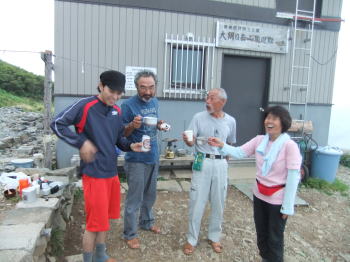 No.467 (H.24.08.24) 辛いほど飲まなくても・・ 二日酔いの「山ノ神」は、喉に物が通らなかった。 「大丈夫だ!」 と言っても、昨夜の点滴による カロリーだけでは持つはずがない。 そして、口には出さずとも気持ちが悪いに決まっている。 8時間半の行程で口にしたのは、水の他に、50円程度の 大きさの大福餅を、2ヶ食べただけであった。 励ましの言葉として、「ガンバレ!」と言えば、 「頑張っているのに・・何か違った言葉がないか!」と怒る始末。 後に着いていると、「先に行け!」 と言い、先に行けば、 「行ってしまった。」 と支離滅裂である。 避難小屋に着いて宴が始まるや否や、私にもとコップを出す。 「汗になって悪い物が全部出てしまった。」 「もうすっかり治った。」 だとか・・・ ![]() |