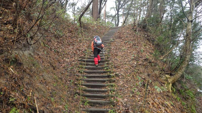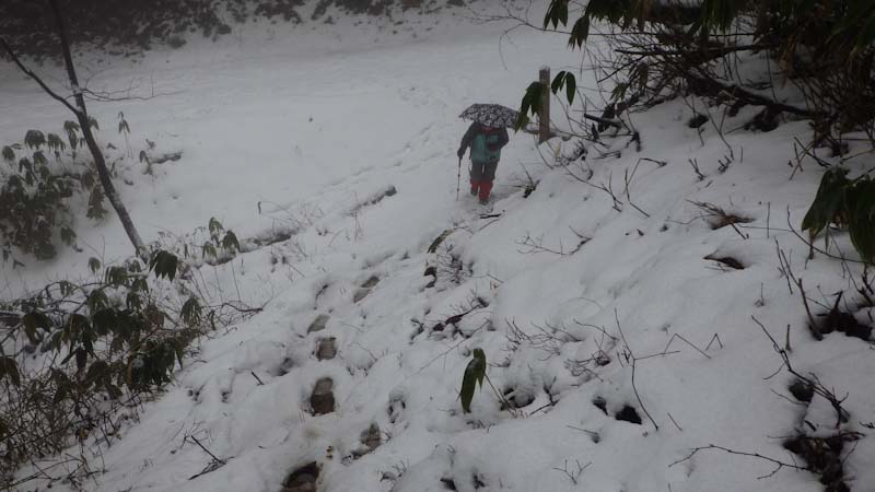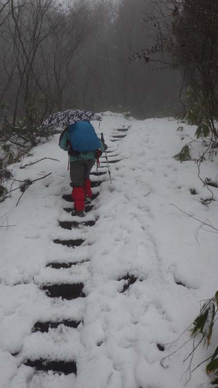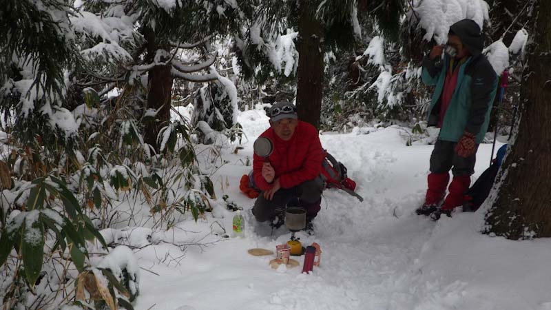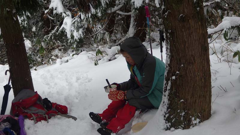 山頂まで、直線であと200mの所で、食事処にしようか迷ったので、荷を置いて「山ノ神」を迎えに行った。(荷を担ぎに行った。)それでも、山頂に行くという事になって安堵したが・・・。そして、言う事がきつい。 ”先に行ってお湯を沸かしておけ!” なのだから!