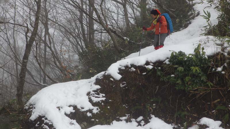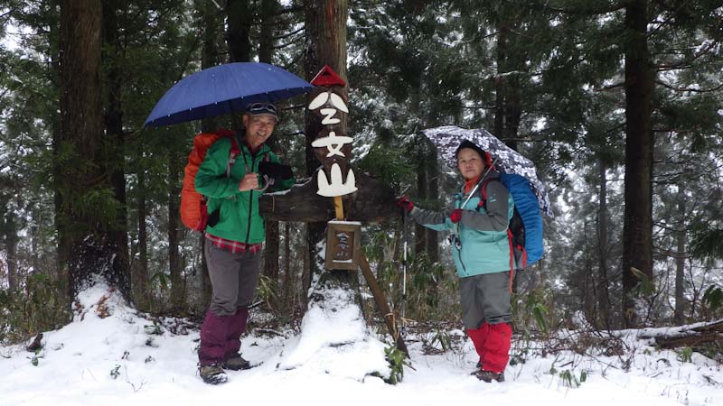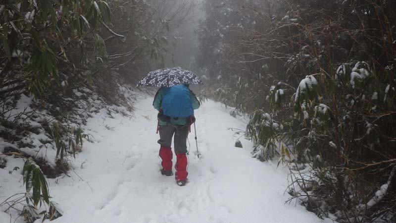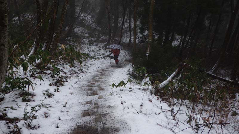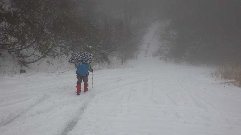 1/20 相変わらず雨でも行く。しかし、八乙女山登山口で雨が止んだ。7合目辺から昨夜の雨が雪になったらしく、ちょっぴり白かった。8合目から、雪上を歩く。そして、雪が降り出した。その雪も降ったり止んだり。そして、時たま青空らしきものが顔を出しては、すぐ隠れるという空模様。