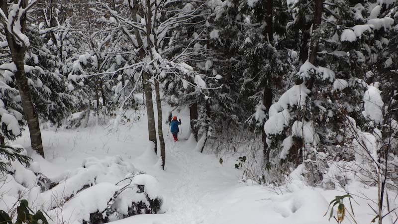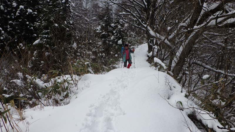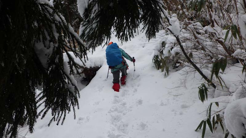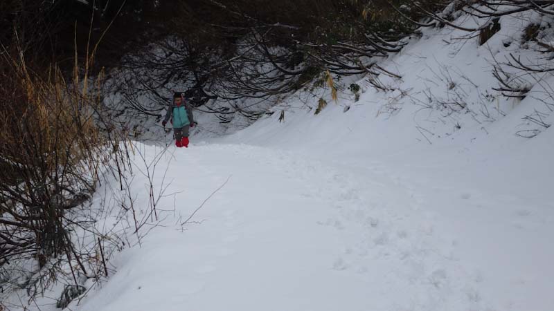 小一時間山頂に滞在。のち登山道(道宗道)を提案。「林道は遠いよ!」 も付け加えた。昨日のものと思えるトレースが、かすかに残っている。そして、急斜面も雪量がそれなりにあったから、滑る心配もあまりなかった。そんなので、今日も7時間山中で戯れた。歩けば歩くほど元気になるのならいいのだが、そんなに上手くはいかない。