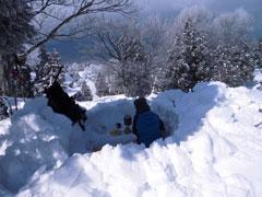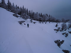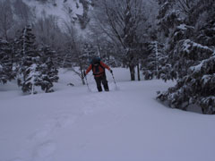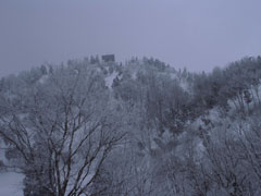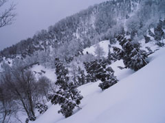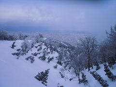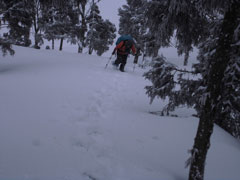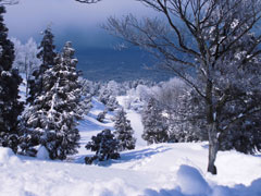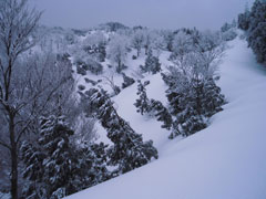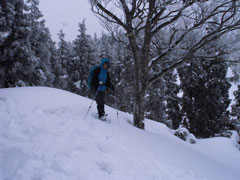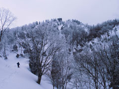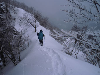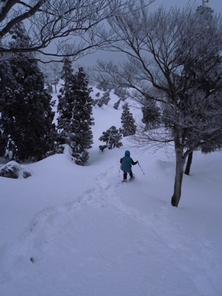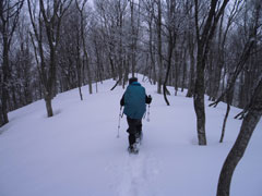 砺波に入って雪となり、閑乗寺スキー場は真っ白であった。しかし、歩き始めは、スノーシューを担がなければいけないほどの雪量であったが、それはすぐに解決した。しかし、昨夜から揉めた我が家では、ずっと引き摺り沈黙の登高となる。世には面白い表現をする人達がおり、「お互い単独行」 ではと言われた。