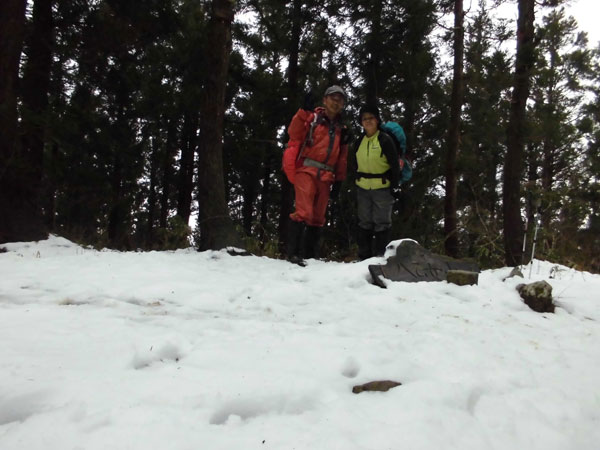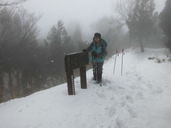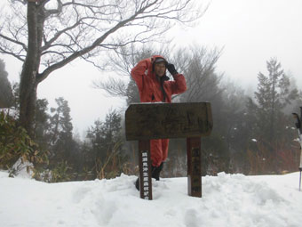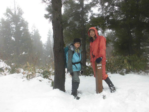 登山口から3時間と切っていただけに、雪が深くなっても、風雪が強くなっても、私は歩き通した。大寺山頂には、大きな看板(標識)が一つあるだけで、身が縮む思いであった。後続の「山ノ神」に、「30~40分程の時間があるから、食事をするか?」 と問うてみたが、「寒いから、すぐ戻ろう。」 との返事に従う事にした。