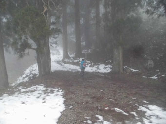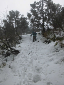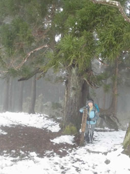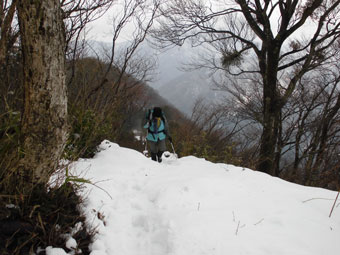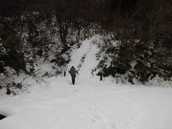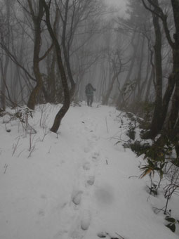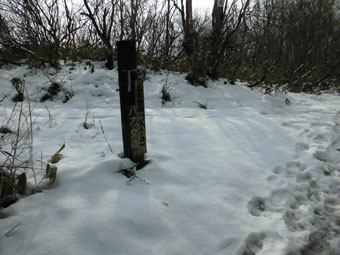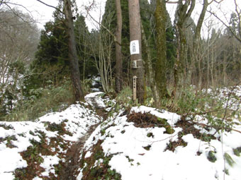 栃原峠から、その道宗道を辿った。ズルッと滑る所もあったが、それなりの雪量となり、ぐるっと回っている林道より、はるかに近いと感じたのは、大寺山近くの反射板を見たときであろう。雨が雪に変わって、風が伴った時は、「何でこんな所に行かなければいかないのか?」 という顔をした「山ノ神」に、私は掛けてやる言葉がなかった。
