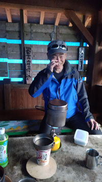 でも、決して雨が好きではなく、歩かなければならないから行くだけの事である。行かなければ、ジムをサボったのと同じである。雨が強くなり風も伴った。朝高の気温も急降下の様相を呈した。東屋でコーヒーを頂き、シュークリームを食べた。のち三角点まで。