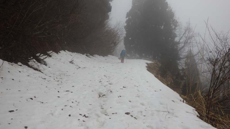 | 栃原峠を越えると、林道にこのような残雪が・・・ |