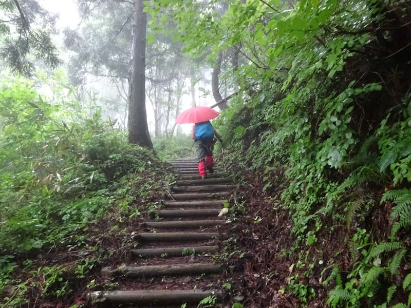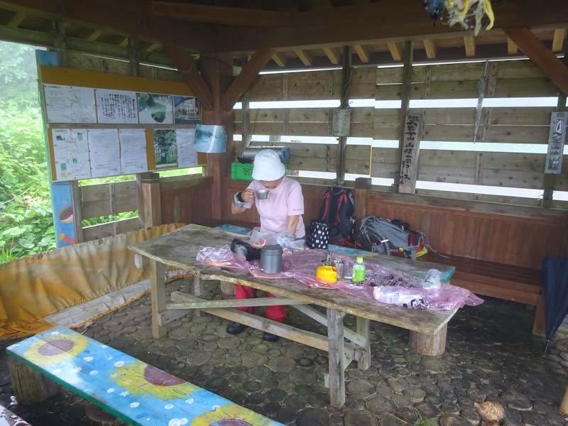 我々は、いつもの通り、ヤワヤワと歩いた。傘を差しながら滑らないようにである。展望があるわけもなく、可愛いお花に出会うわけもないのにである。 (通の人達には、小さなお花が目につくようであるが・・) 東屋で休んでいたら、YAMAP繋がりのグルートさんが、お花目当てでやって来られたらしい。(初対面、挨拶してすぐに立ち去られた。)