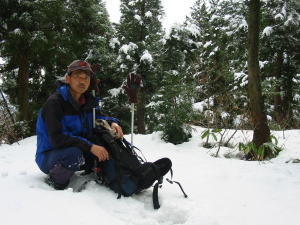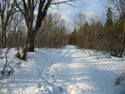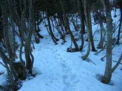 もう10分ほど(登山口から20分ほど)登山道を辿ったら、雪が現れてどんどん量が増えていった。雪質が硬かったものの、時々膝上まで沈む所もあった。