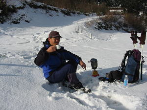 ゴボ・ゴボと沈むようになってもカンジキを着けなかった。それでも、何にもない山頂に20分ほどで着いてしまった。狭くて杉に囲まれた山頂に長居をする事なく、再び峠に戻ってコーヒータイムとした。