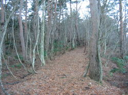 わからないながらも、樹木を眺めながら、“コナラだ!” “ミズナラだ!” などと樹皮に触ったり、葉を拾って比べたりして頭を上げたら、黒い物体が目の前にいた。あちらさんもビックリしたかもしれないが、こちらも腰が抜けるようにビックリしてしまった。このところ低山でよく見かけるカモシカである。あちらも7~10mほど移動したが、首にぶら下げたデジカメを持って、「カモちゃん、カモちゃん」と近付いて撮ったつもりであるが、またもピンボケに近いものが多かった。