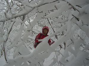 | 雪の重みで小枝が道を塞いでいる。 | トレースのないのは気持ちが良い。 |