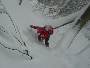 | 急斜面に喘ぎ喘ぎ・・・ | 樹木が倒れ、登山道が塞がれている。 |