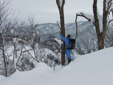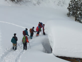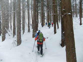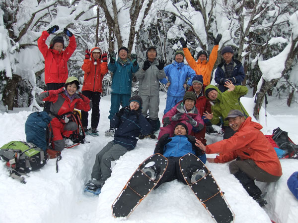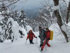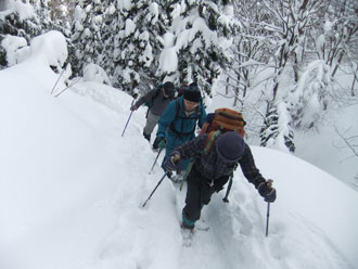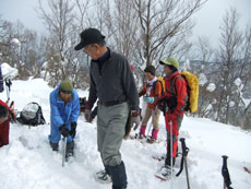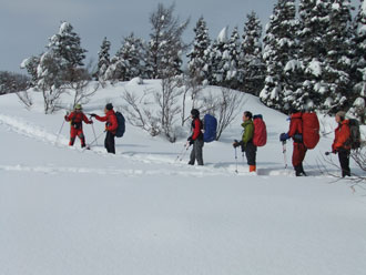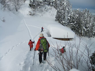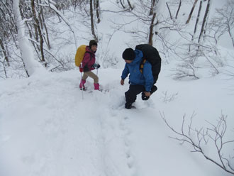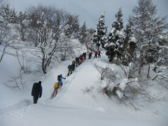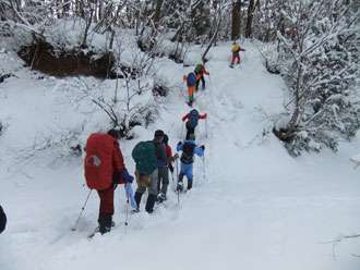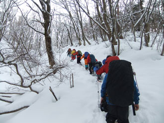 | 一旦、林道に出て、斜面を駆け上がる。 | 整然と、14名のパーティーが行く。 |